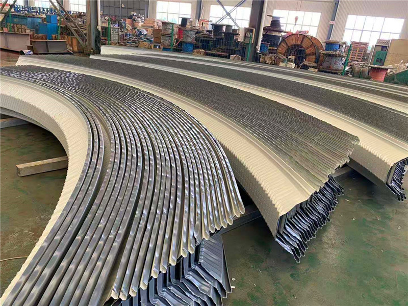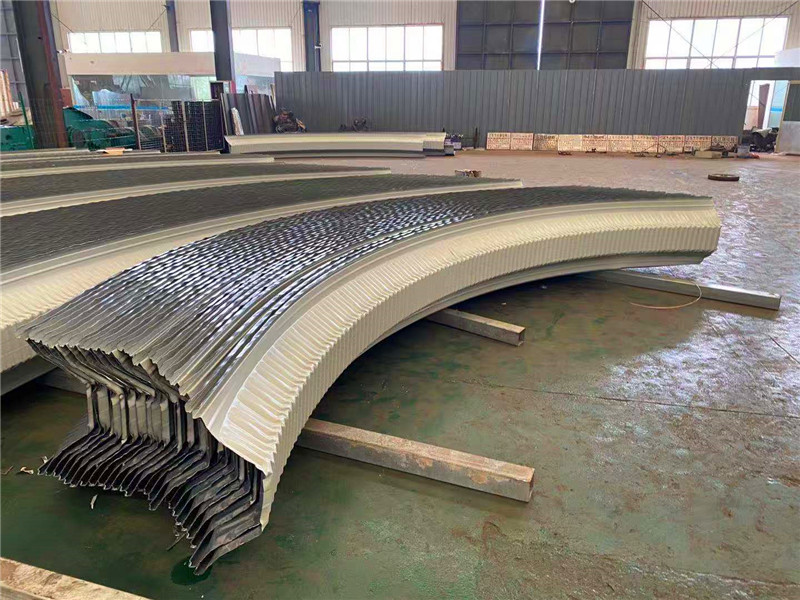 本次拱形屋頂單元板工程主要服務于某出口型廠房的建筑改造升級,客戶對結構穩固性、現場加工效率及防護性能提出了較高要求。根據需求,江蘇杰達鋼結構工程有限公司選用了厚度為1.2mm的鋼板原材料,壓制成寬度為0.61m的成型瓦片,并采用現場彎板壓型技術進行施工。